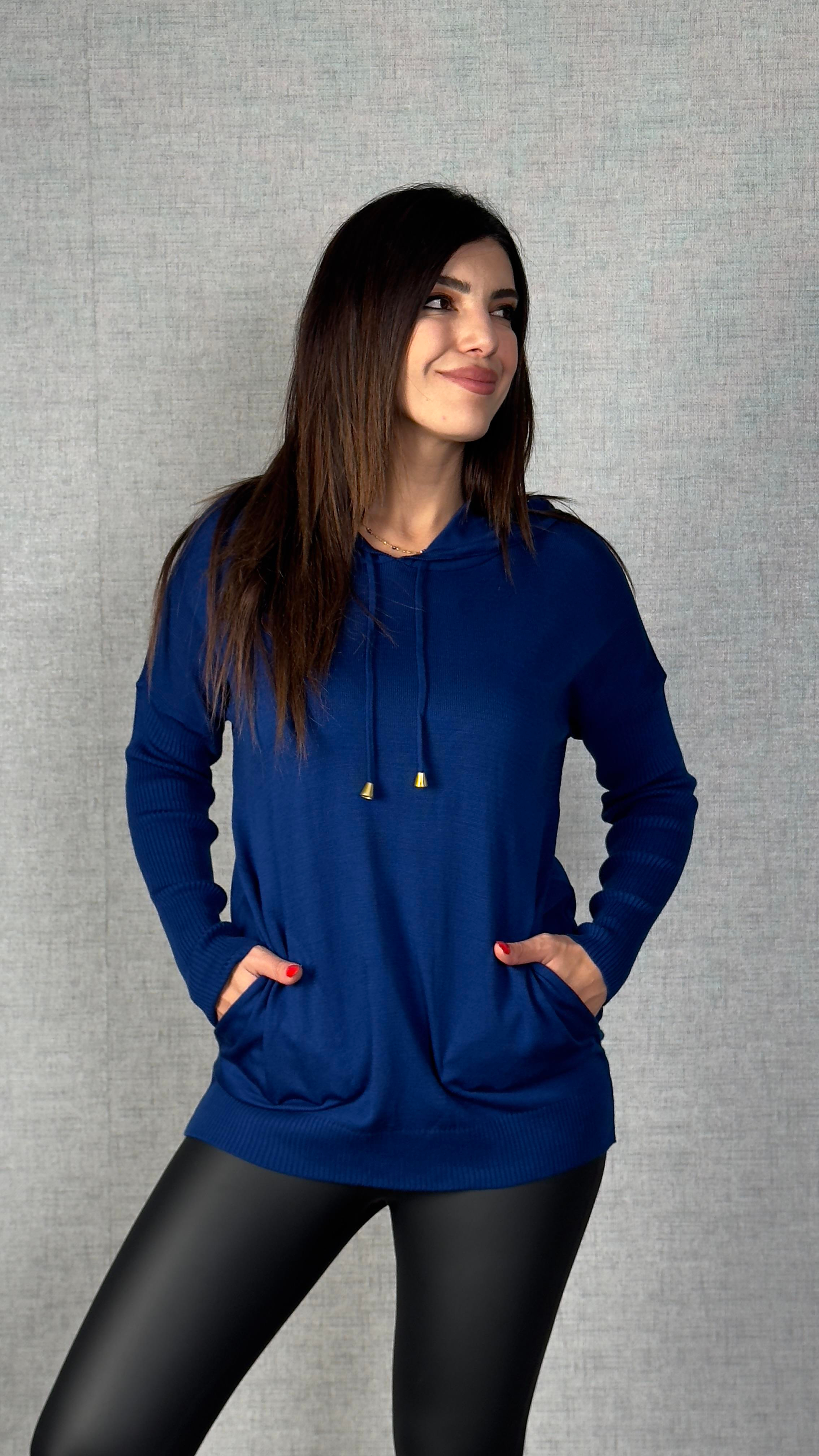 Agnes Mavi Kapüşonlu Cepli Triko Kazak
