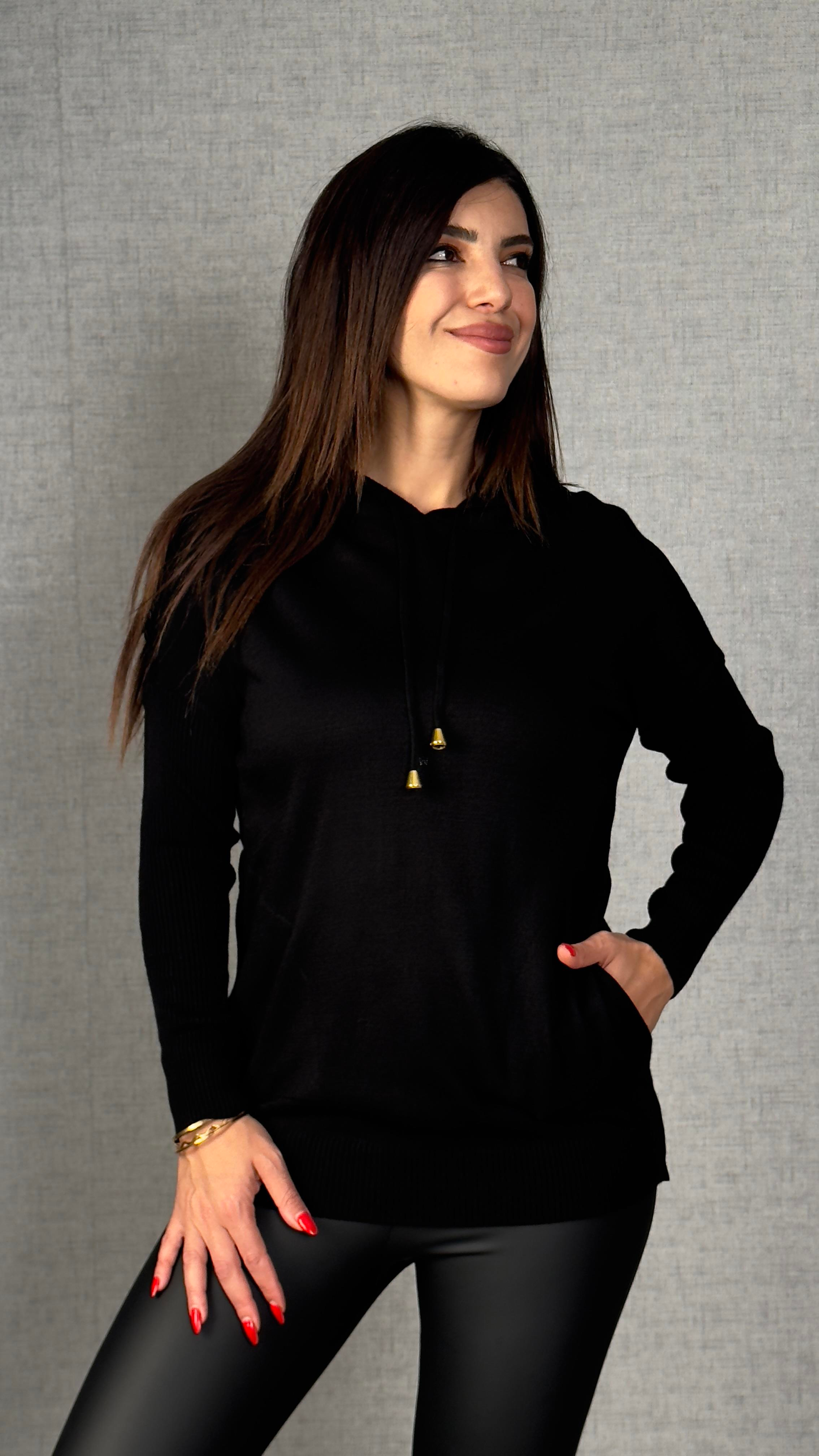 Agnes Siyah Kapüşonlu Cepli Triko Kazak