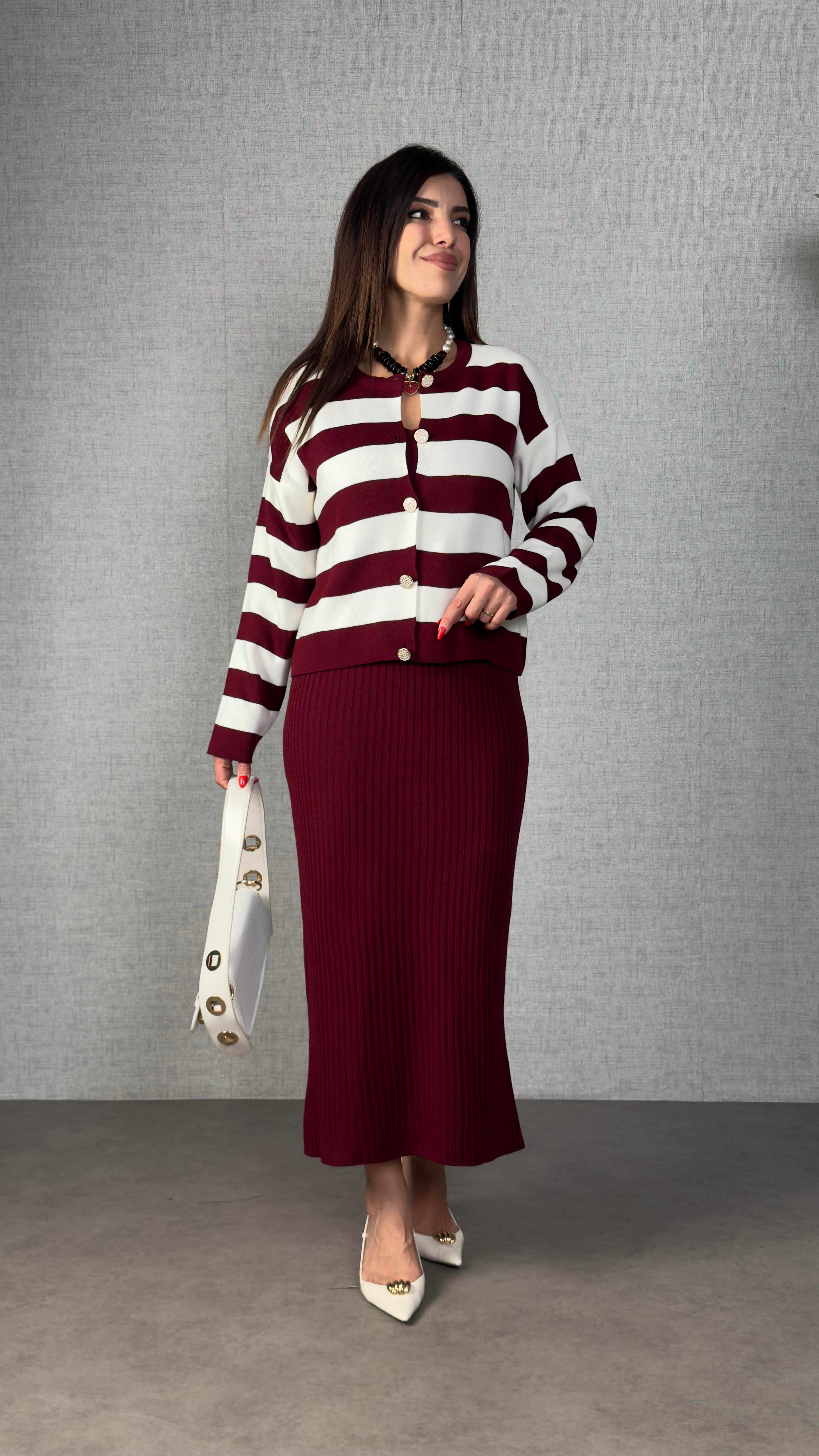 Daria Bordo Çizgili Hırka Elbise İkili Triko Takım