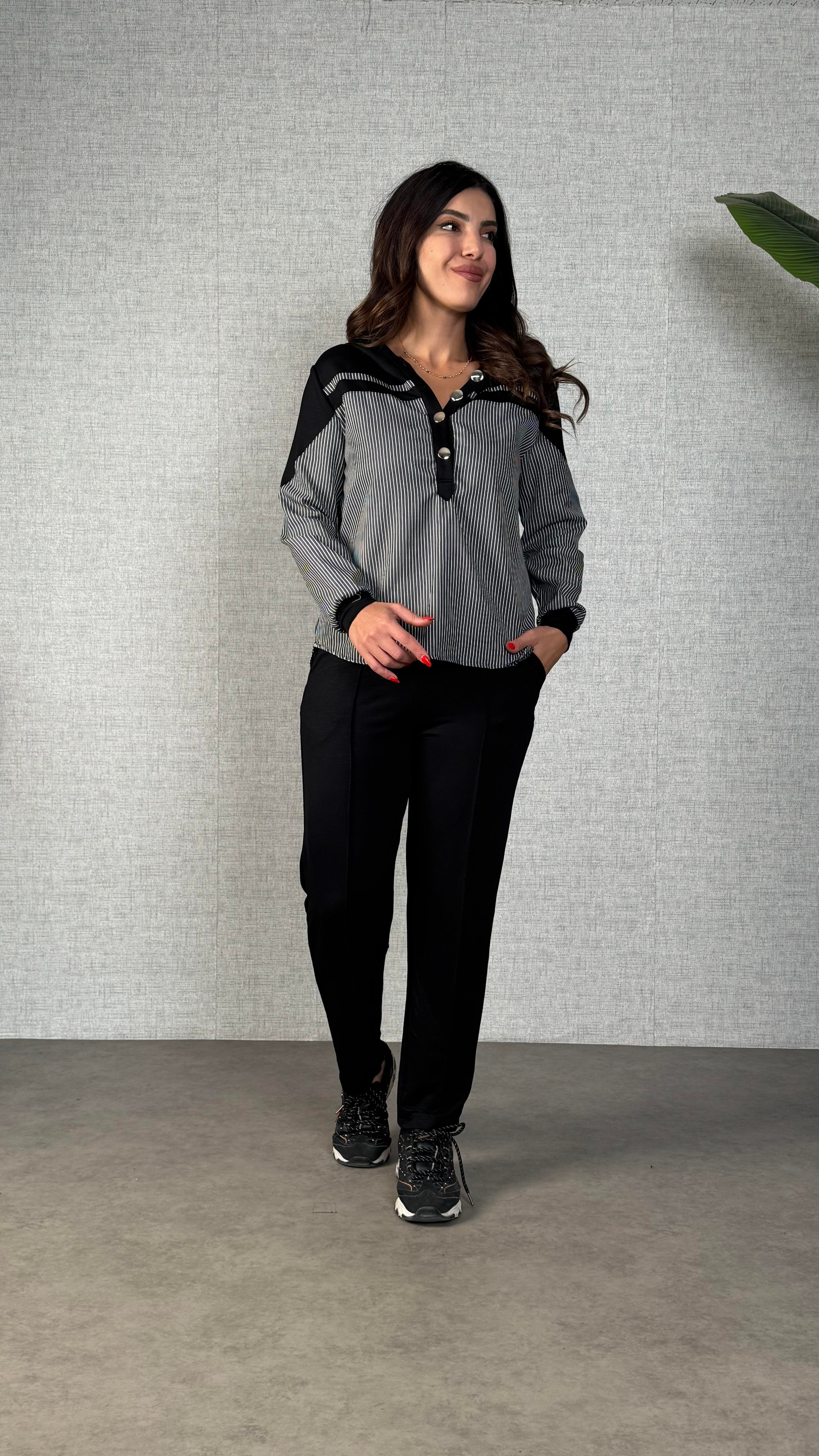 Lana Siyah Kapüşonlu Gold Düğmeli İkili Takım