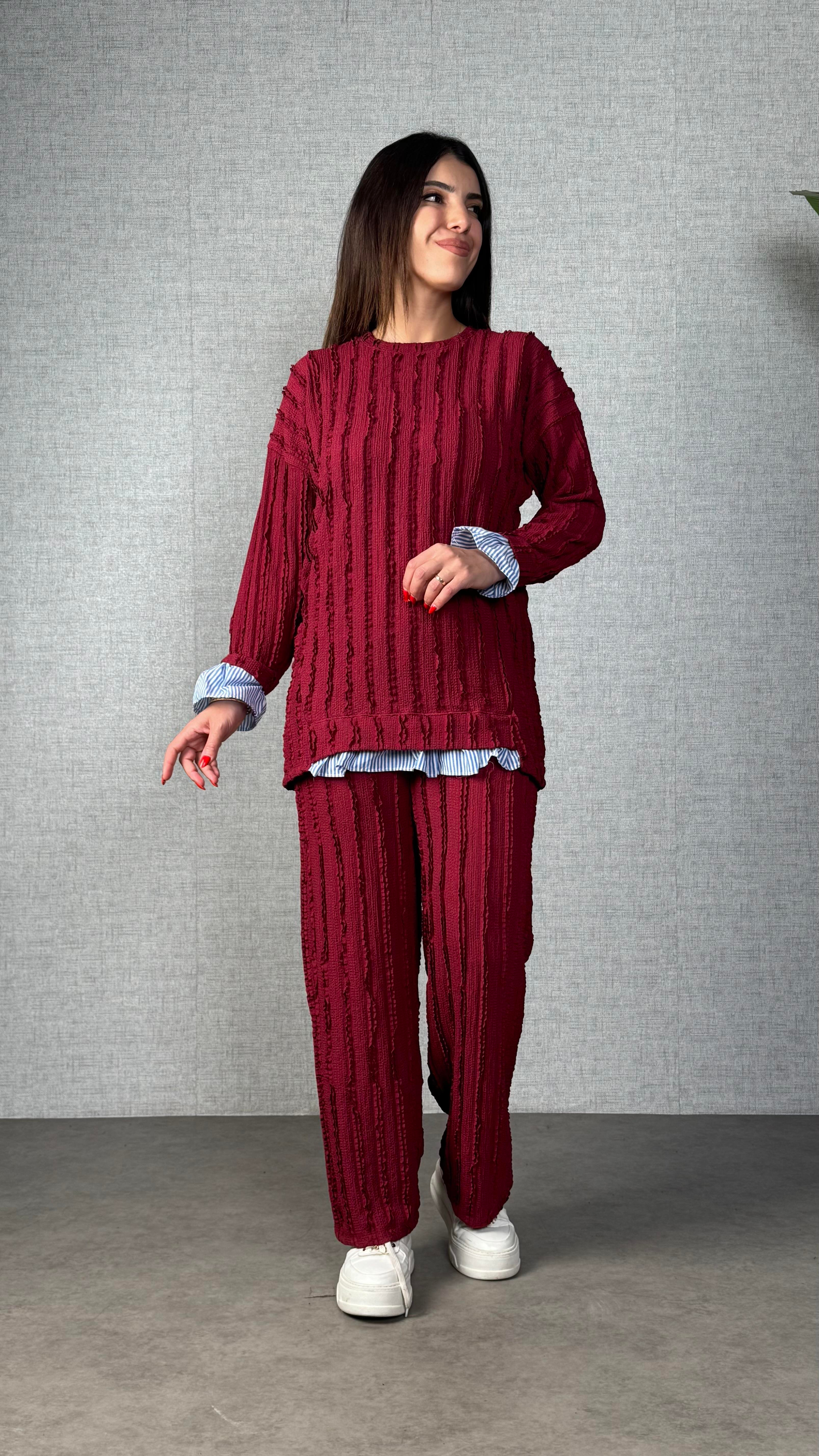 Livi Bordo Gömlek Detaylı Fırfır Kumaş İkili Takım