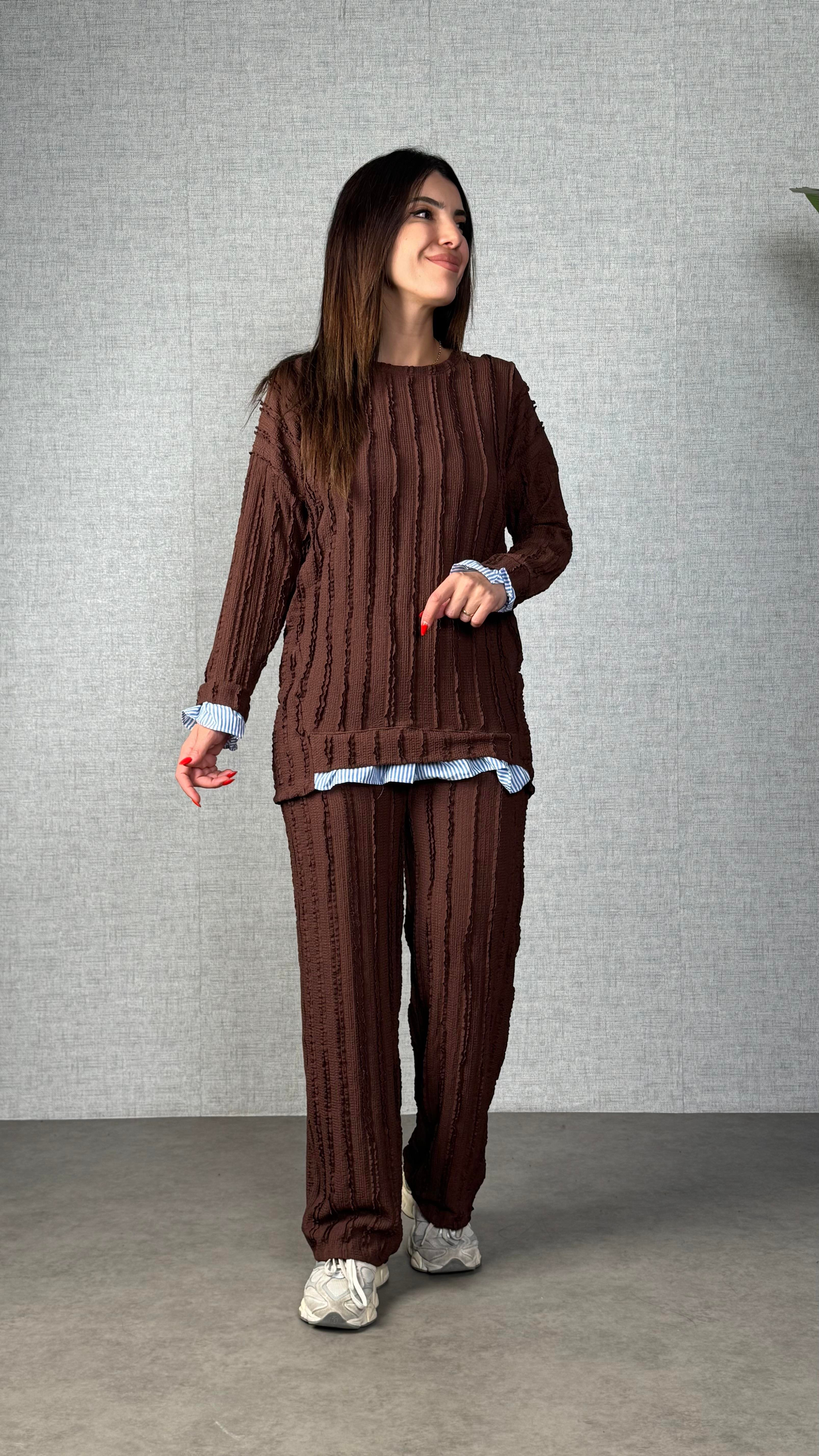 Livi Kahverengi Gömlek Detaylı Fırfır Kumaş İkili Takım