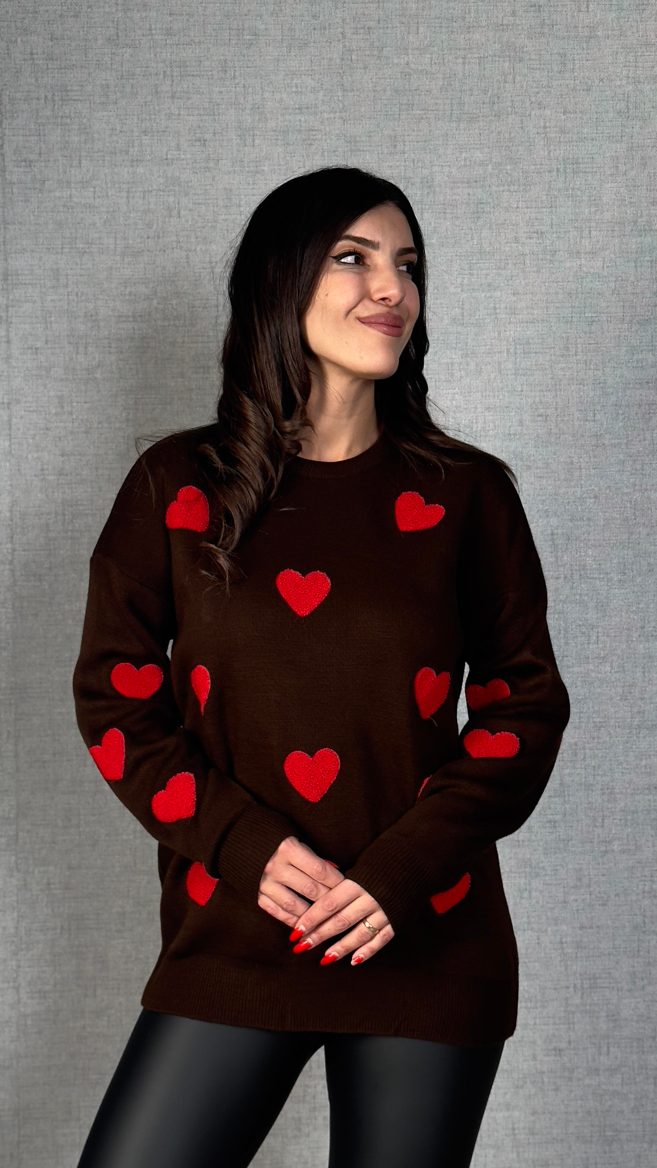 Love Kahverengi Kalp Desenli Triko Kazak Love Kırmızı Kalp Desenli Triko Kazak Love Yeşil Kalp Desenli Triko Kazak