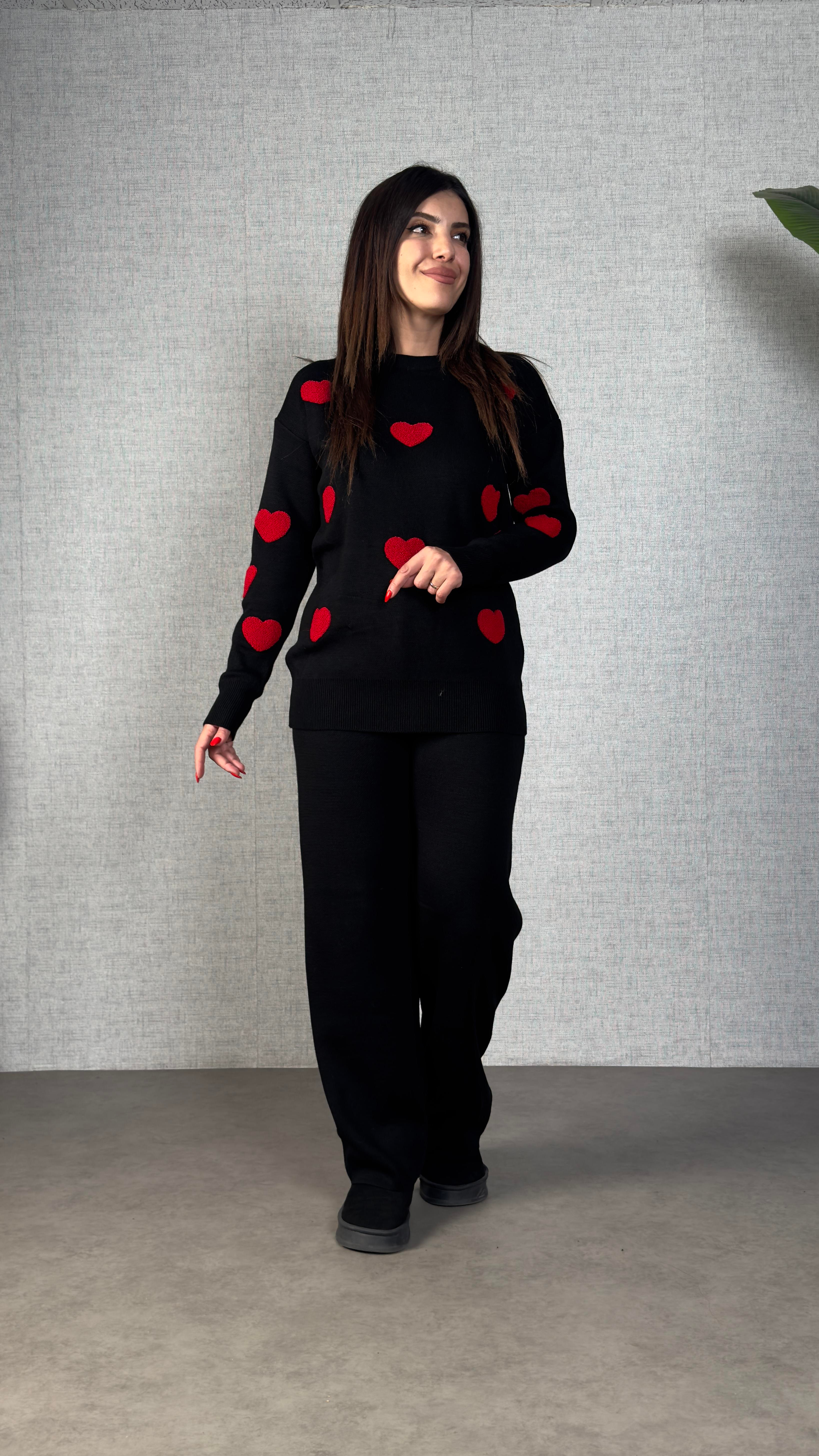 Marly Ekru Kalp Desenli Triko Takım Marly Kırmızı Kalp Desenli Triko Takım Marly Siyah Kalp Desenli Triko Takım