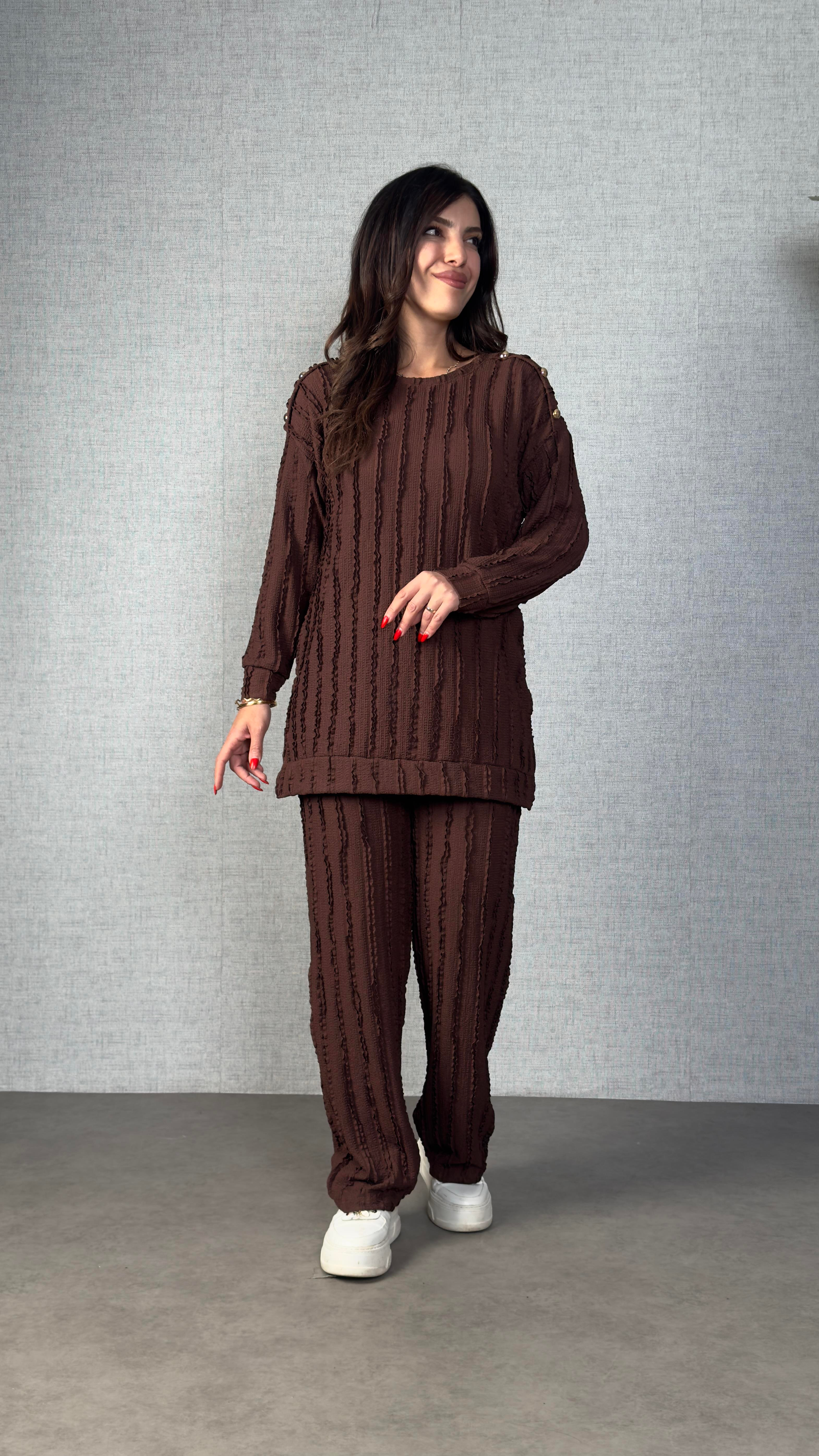 Noon Kahverengi Gold Düğmeli Fırfır Kumaş  İkili Takım