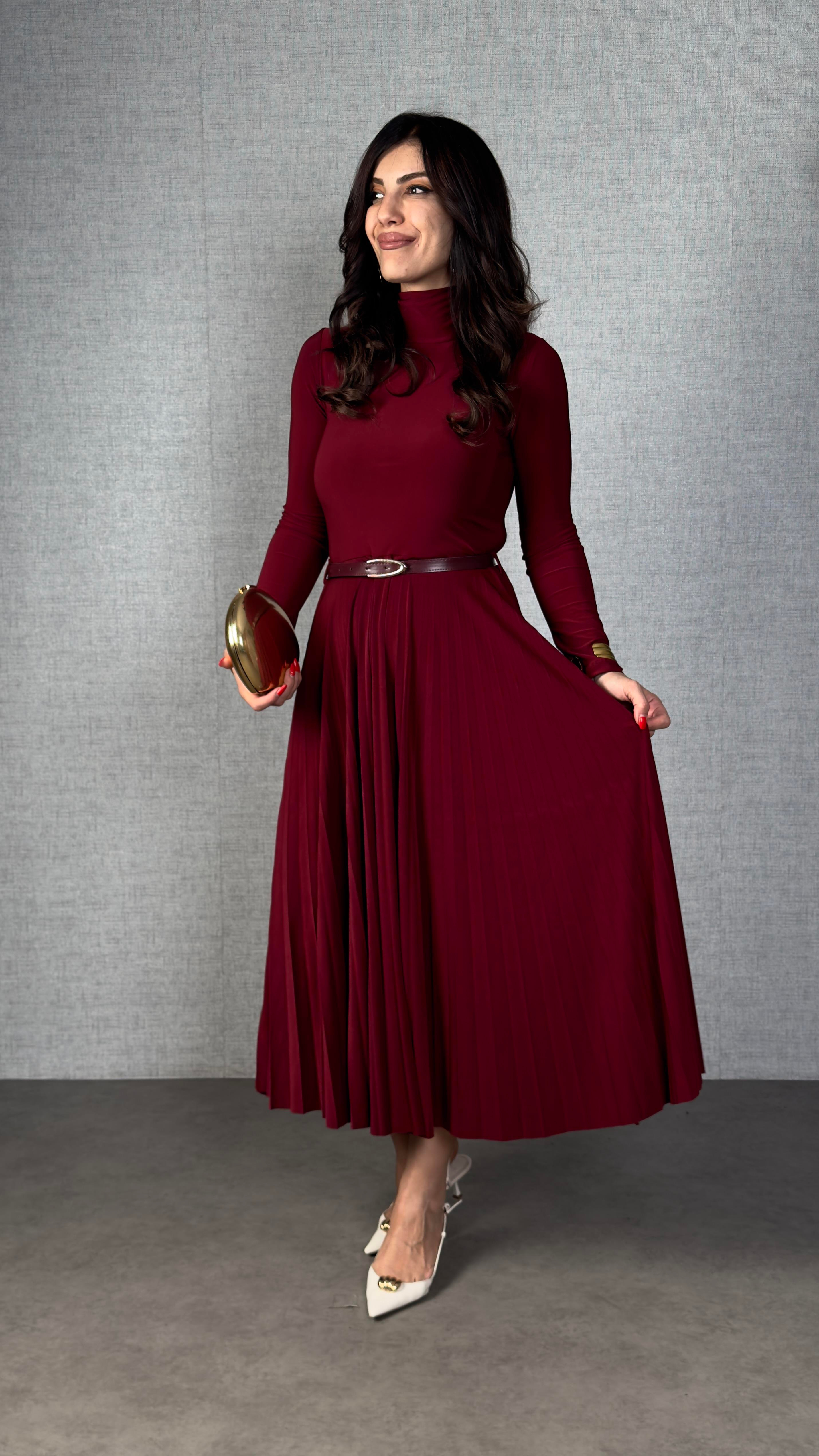 Ricas Bordo Sandy Pliseli Kemerli Elbise Ricas Siyah Sandy Pliseli Kemerli Elbise Ricas Kahverengi Sandy Pliseli Kemerli Elbise