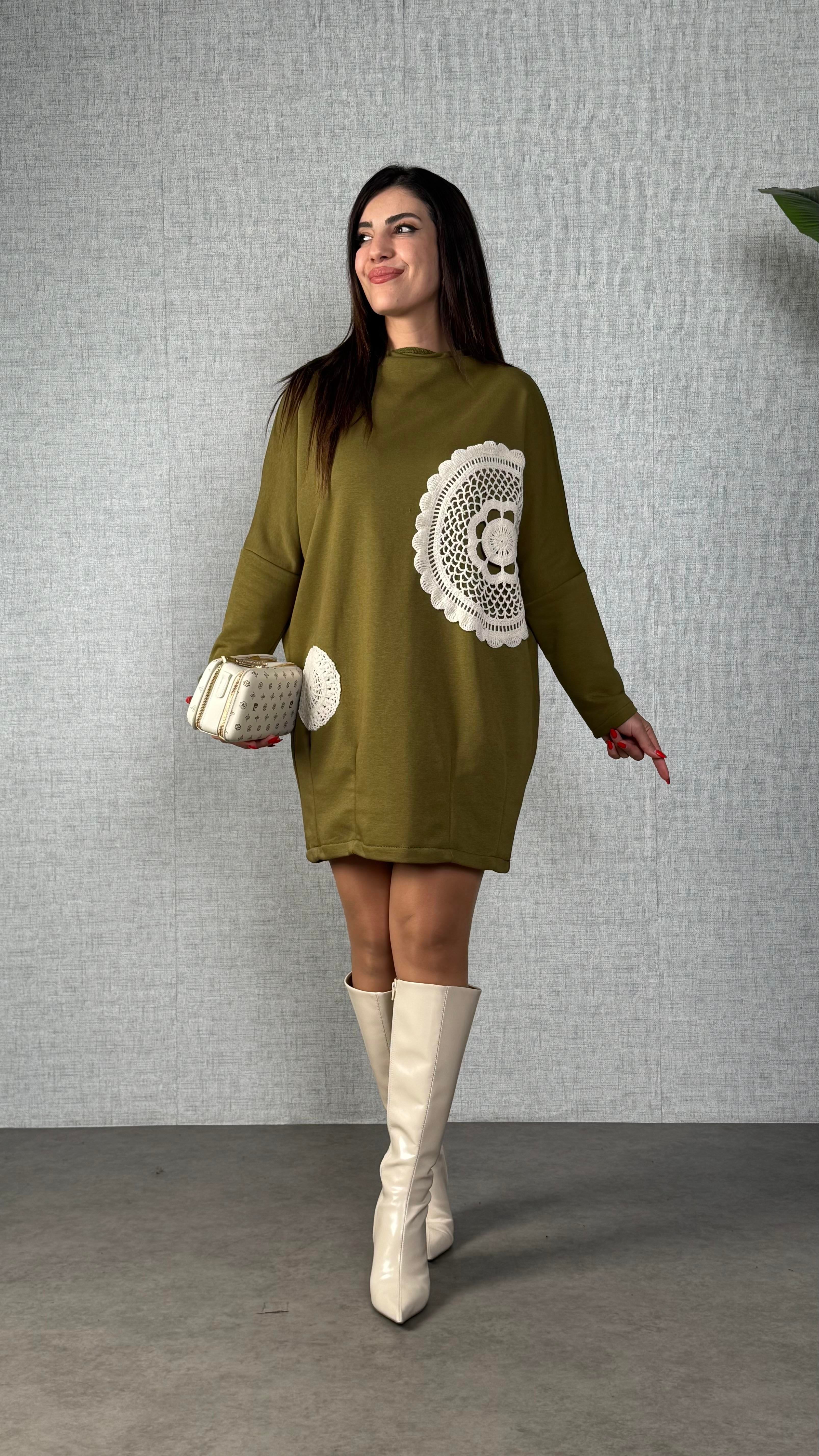 Teresa Yağ Yeşili Dantel İşlemeli Salaş Elbise
